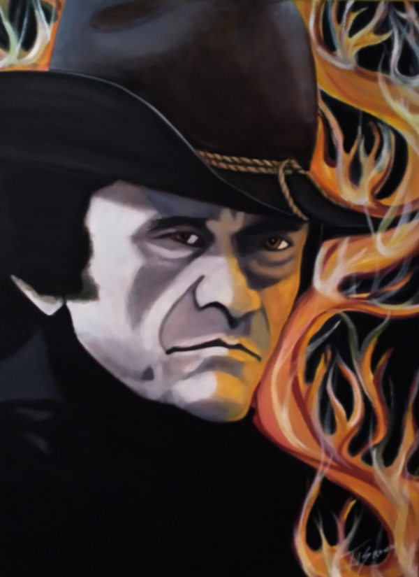 painting: oil on canvas This is an original work. Height 22" x Width 30" x Depth 1" Year Produced: 2015 Inventory ID TB_0006 Status: All Galleries Price: $700.00 Narrative: Johnny Cash in the ring of fire |