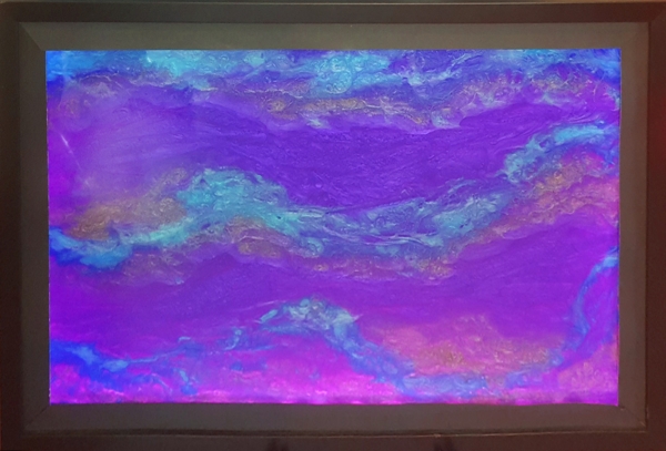 Painting: Mixed Media Blue Metallic fusion Epoxy painting with color changing LED's This is an original work. Height 18" x Width 25" x Depth 1.5" Year Produced: 2015 Inventory ID CC_0001 Status: Hyder Gallery Price: $740.00