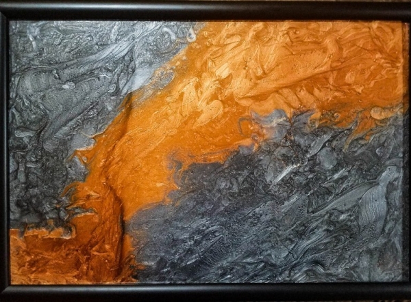 Painting: Mixed Media Gray and brass metallic fusion epoxy painting in a black frame This is an original work. Height 18" x Width 26" x Depth 1" Year Produced: Unknown Inventory ID CC_0016 Status: Hyder Gallery Price: $430.00