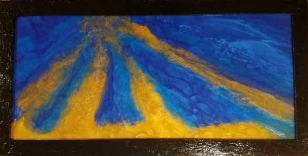 Painting: Mixed Media Color Changing LEDs with a Honey, mandarin, ocean shimmer, and maui metallic fusion epoxy painting with a texture black frame This is an original work. Height 26" x Width 51" x Depth 1.5" Year Produced: 2017 Inventory ID CC_0030 Price: $1,500.00 As the lava descends into the ocean blue, chemical reactions bubble forth. |