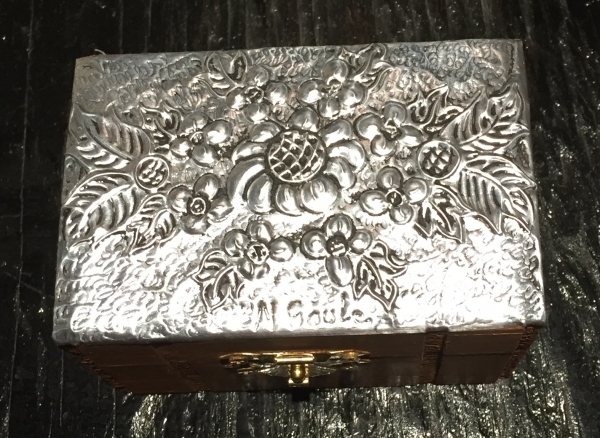 Relef : Embossed aluminum Floral pattern in Boston aluminum on a wooden box This is an original work. Height 2" x Width 3.5" x Depth 2.5" Year Produced: Unknown Inventory ID MS_0005 Status: Sold (public) Price: $20.00