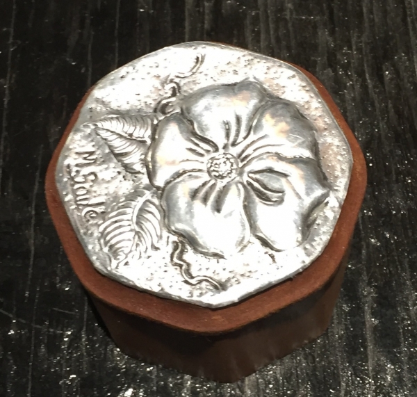 Relef : Embossed aluminum Floral embossed aluminum on an octagonal box This is an original work. Height 2" x Width 3" x Depth 3" Year Produced: Unknown Inventory ID MS_0006 Status: All Galleries Price: $20.00
