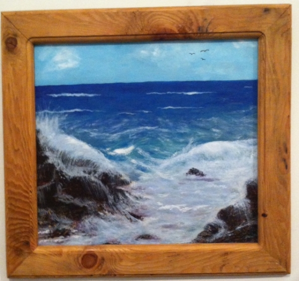 Narrative: My dear husband made this frame for me and I saw this seascape in the grain of the wood. It had to be let out of its prison. |