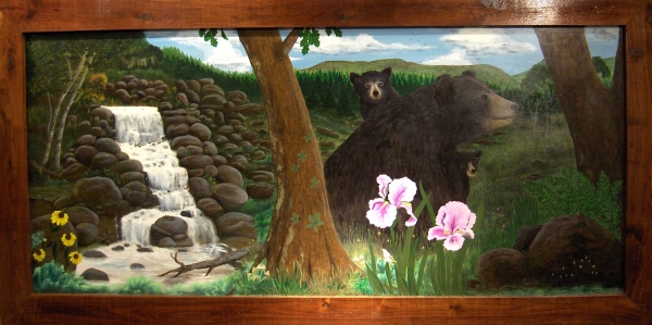 Painting: Acrylic on Wood and Handcrafted frame A view of a waterfall and a mother bear and two cubs. This is an original work. Height 48" x Width 96" x Depth 3" Year Produced: 2010 Inventory ID SH_0095 Price: $3,000.00 This project started in 2008 when my husband built this huge canvas with solid Walnut frame from Appalachian Mountain Walnut. This just had to have a mountain scene in it. I worked on it for two years before it became the final work. You grow to love a picture like this over the years. |