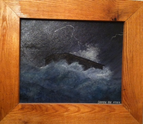 Painting: Acrylic on Canvas Board The True Appearance of the Ark in the Flood. This is an original work. Height 22" x Width 25" Year Produced: 2002 Inventory ID SH_0102 Price: $275.00 This was done with my three grandchildren who also painted an Ark that day. We had a Noah day and even baked a chocolate cake shaped like this ark.. What fun. |