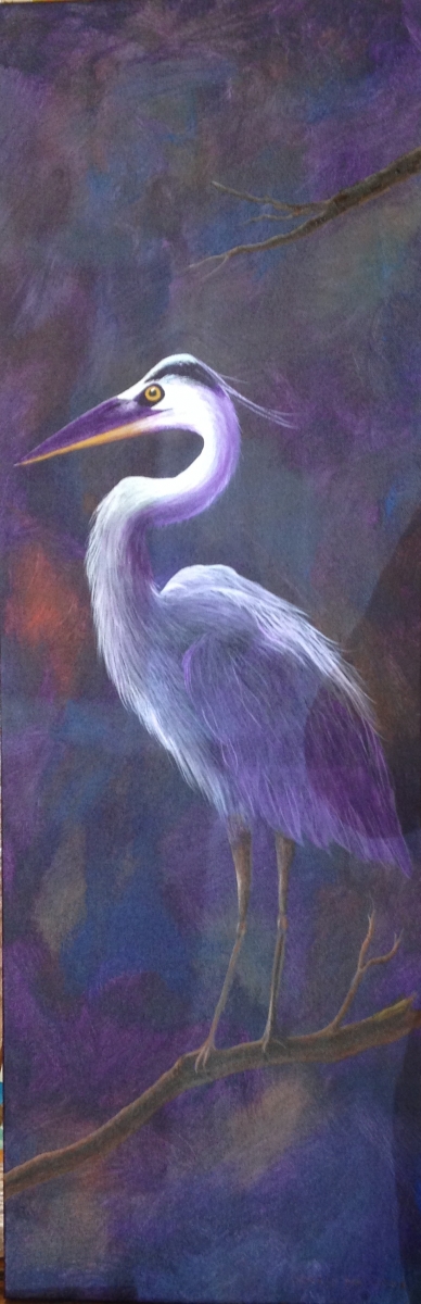 Painting: Acrylic on Gallery Wraped Canvas A great Blue (purple) Heron... on a branch... This is an original work. Height 36" x Width 12" Year Produced: 2014 Inventory ID SH_0115 Status: All Galleries Price: $275.00