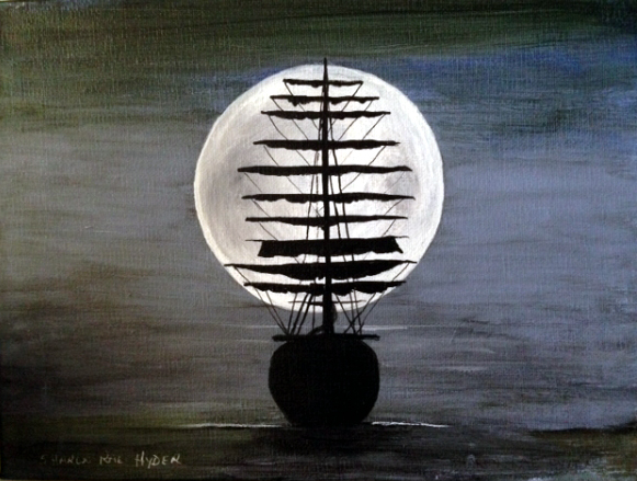 Painting: Acrylic on stretched canvas A Boat with unfurled sales in the shadow of the full moon. This is an original work. Height 9" x Width 12" Year Produced: Unknown Inventory ID ACWG23 Status: All Galleries Price: $35.00