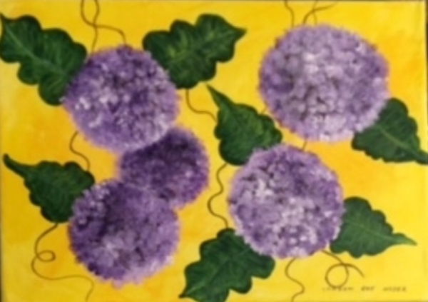 Painting: Acrylic on Canvas Five purple abstract hydrangeas floating in a yellow background. This is an original work. Height 9" x Width 12" Year Produced: Unknown Inventory ID SH_0237 Status: All Galleries Price: $35.00
