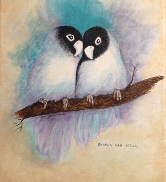 Painting: Acrylic on Canvas Two sweet little love birds snuggling on their branch.. This is an original work. Height 12" x Width 9" Year Produced: Unknown Inventory ID SH_0243 Status: Sold (public) Price: $0.00