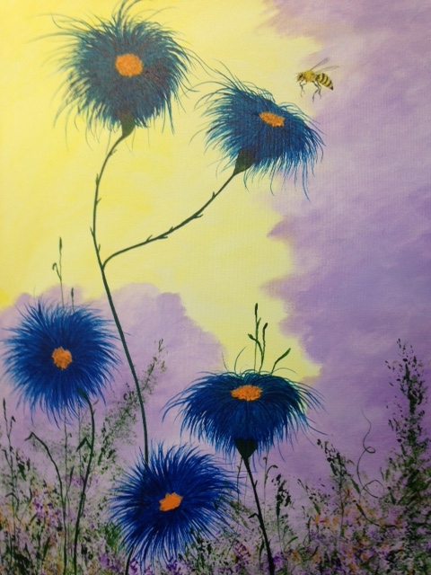 Painting: Acrylic on stretched canvas Five Blue Flowers and a little Bee This is an original work. Height 0" x Width 0" Year Produced: Unknown Inventory ID SH_0250 Status: Sold (public) Price: $0.00
