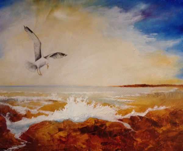 Painting: Oil on Gallery Wrap Canvas Seagull about to catch a fish in the surf crashing on the rocks. This is an original work. Height 16" x Width 20" x Depth 2" Year Produced: Unknown Inventory ID SH_0255 Price: $350.00 This is a rework with a pallet knife and brush. |