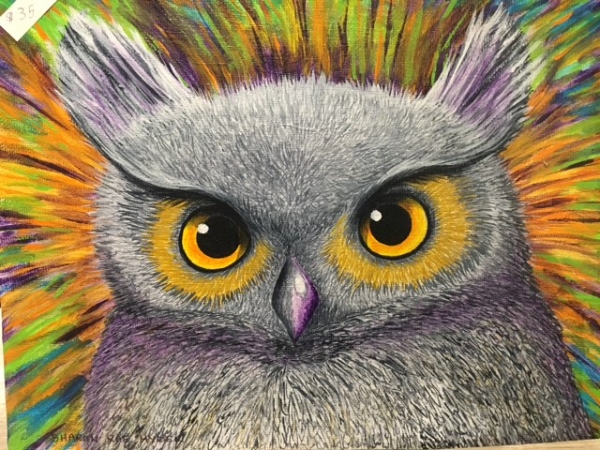 Painting: Acrylic on Canvas Board A Big eyed owl... with vibrant colors. This is an original work. Height 9" x Width 12" Year Produced: Unknown Inventory ID SH_0259 Price: $0.00 This was a class... I love owls... They are so adorable... |