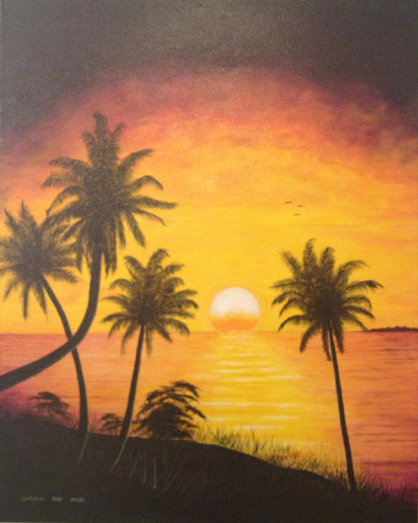 Painting: Acrylic on Canvas Beautiful sunset with silhouetted palms on Sunset Key overlooking the Gulf of Mexico near Key West. This is an original work. Height 30" x Width 24" Year Produced: Unknown Inventory ID SH_0008 Status: All Galleries Price: $325.00