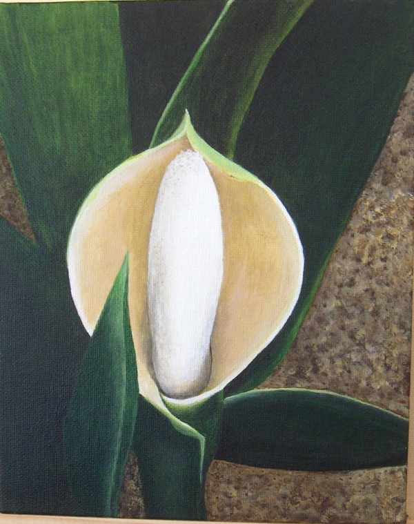 Painting: Acrylic on Canvas Flower of the split leaf Philodendron. This is an original work. Height 8" x Width 10" Year Produced: 2013 Inventory ID SH_0050 Price: $100.00 This was from a students photo from her yard. Quite a task... But rewarding. |