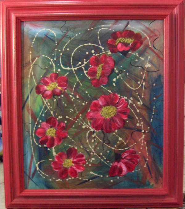 Painting: Acrylic on framed canvas Five falling red flowers in an abstract background. This is an original work. Height 25" x Width 29" Year Produced: 2013 Inventory ID SH_0052 Price: $425.00 Picking the color of the frame made it imperitive to put these incredible flowers inside it.. This just had to be painted... |
