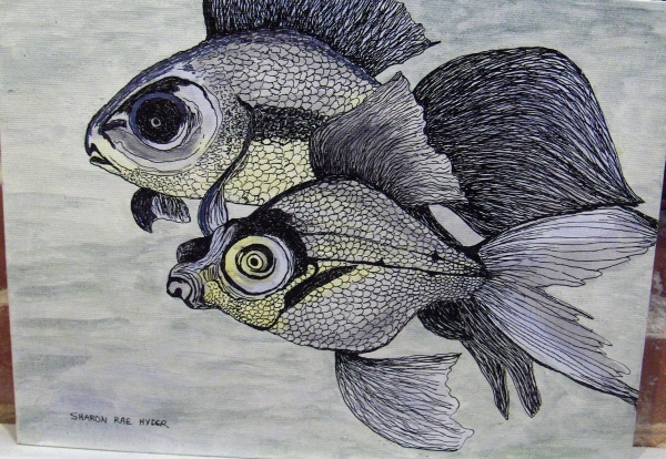 Ink : India Ink on Canvas board Two elaborate fish swiming along This is an original work. Height 9" x Width 12" Year Produced: 2012 Inventory ID SH_0057 Status: Sold (public) Price: $65.00