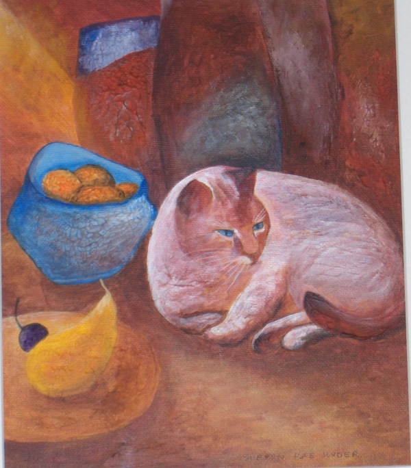 Painting: Acrylic on Canvas Board Framed A curled up kitty warming himself in the rays of the sun coming in a window. He is seated where his master will not like.. This is an original work. Height 13" x Width 15" Year Produced: Unknown Inventory ID SH_0062 Price: $150.00 Request of a student |