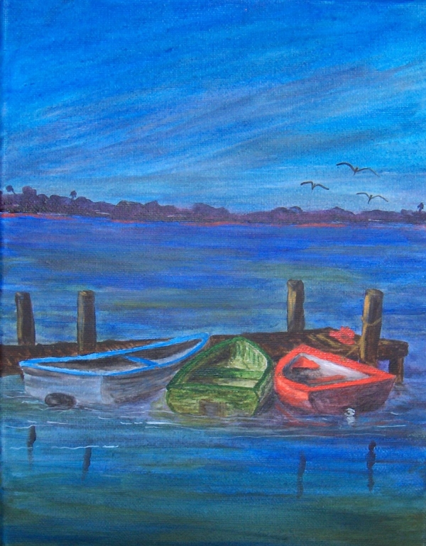 Painting: Acrylic on Canvas Board Three boats tied up at a dock waiting for someone to take them fishing. This is an original work. Height 9" x Width 12" Year Produced: 2013 Inventory ID SH_0068 Price: $30.00 A Student request with lots of changes. |