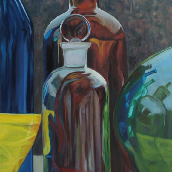Oil Painting on Canvas: Original and Reproduction Available Translucent jewel tones of blue, green, brown and yellow glass against a muted background. Signed, limited edition reproductions of this original painting are available as well. This is an original work. Height 24" x Width 24" x Depth 1.5" Year Produced: Unknown Inventory ID SH_0016 Status: All Galleries Price: $2,000.00