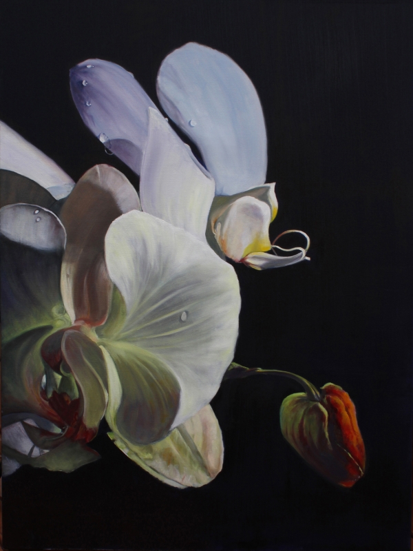 Painting: Oil on Canvas White orchid against black background, luminescent water drops. Signed Limited Edition reproductions available as well. Limited Edition: 3 of 250 Height 40" x Width 30" x Depth 2" Year Produced: Unknown Inventory ID SH_0023 Status: All Galleries Price: $3,900.00