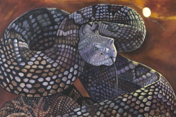 painting: oil painting on canvas This painting has a variety of earth tone colors to make it pop with its striking pose. The background is filled with fiery majestic clouds. This is an original work. Height 18" x Width 36" x Depth 1" Year Produced: 2015 Inventory ID TB_0005 Status: All Galleries Price: $1,500.00 Narrative: Diamond back rattle snake lurking in the mist for prey |
