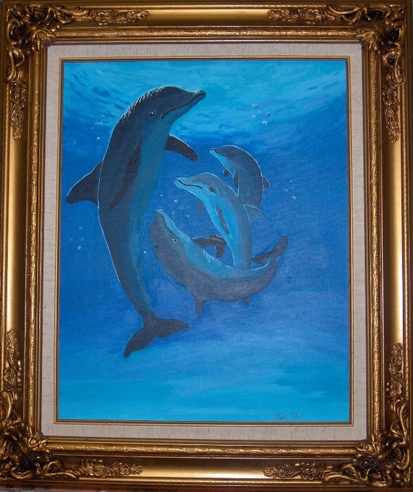 Painting: Acrylic on framed canvas A pod of dolphins playing in the surf. Prints available soon. This is an original work. Height 16" x Width 20" Year Produced: 2012 Inventory ID IA_0001 Price: $0.00 I really enjoyed painting these dolphins because I wanted to do something different and underwater. I am attracted to dolphins because of their curious nature. The original is too dear to me to sell so I am making prints for those who want to collect my work.. |
