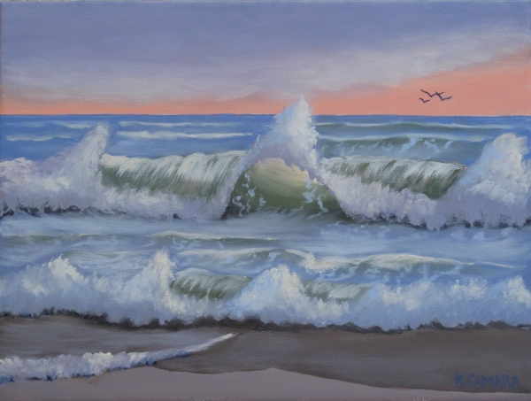 Painting: Oil on Canvas Waves crashing on the beach at sunrise. This is an original work. Height 12" x Width 16" x Depth 1" Year Produced: 2014 Inventory ID KC_0001 Price: $520.00 The waves crashing onto the beach at sunrise break the stillness of the day. They crash onto shore with a big surge, then break up and whisper back to the ocean. |
