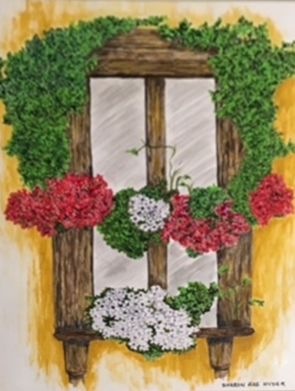 Painting: Watercolor Window with flowers and vines. Matted and framed. This is an original work. Height 8" x Width 10" Year Produced: Unknown Inventory ID SH_0235 Status: All Galleries Price: $95.00