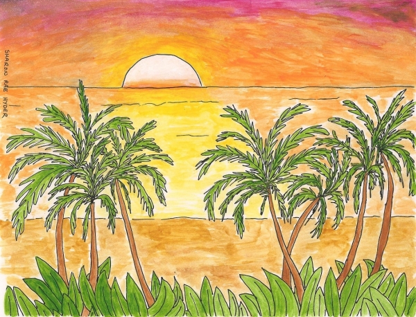 Painting: Acrylic and Inda Ink Palms at sunrise.. This is an original work. Height 8" x Width 10" Year Produced: Unknown Inventory ID SH_0038 Status: Sold (public) Price: $0.00